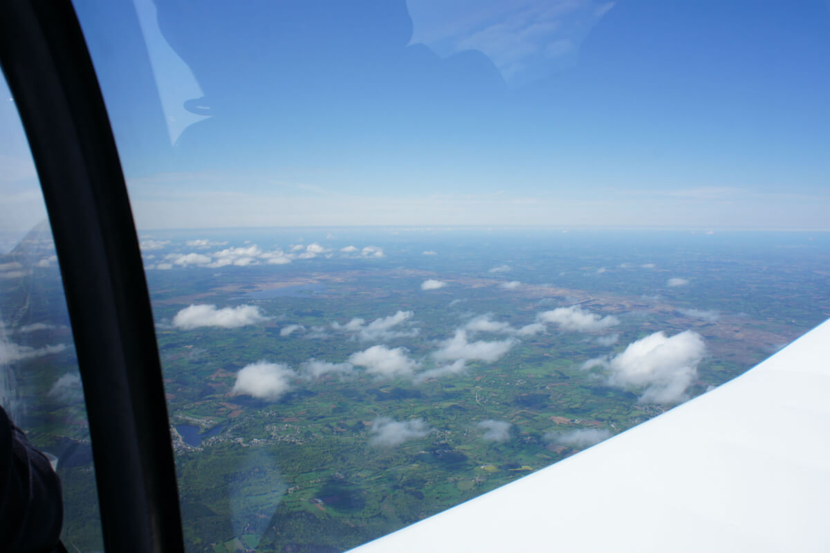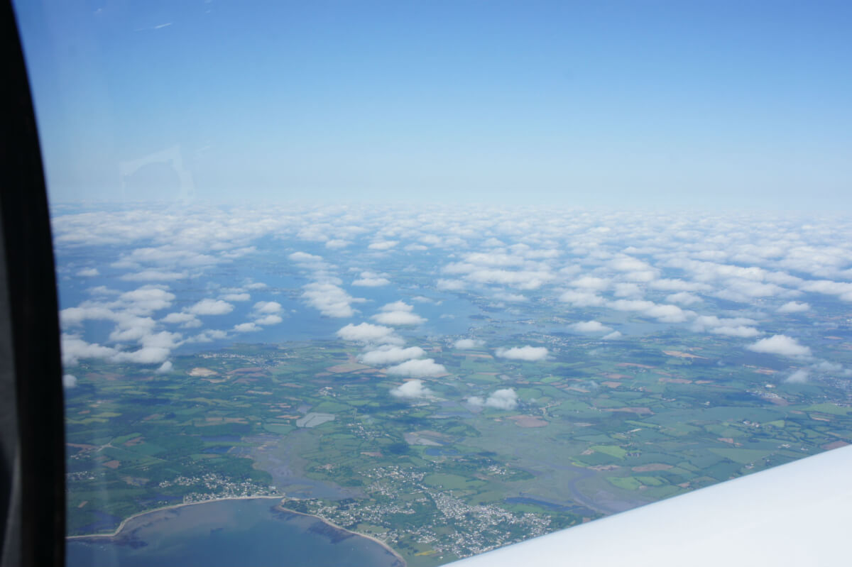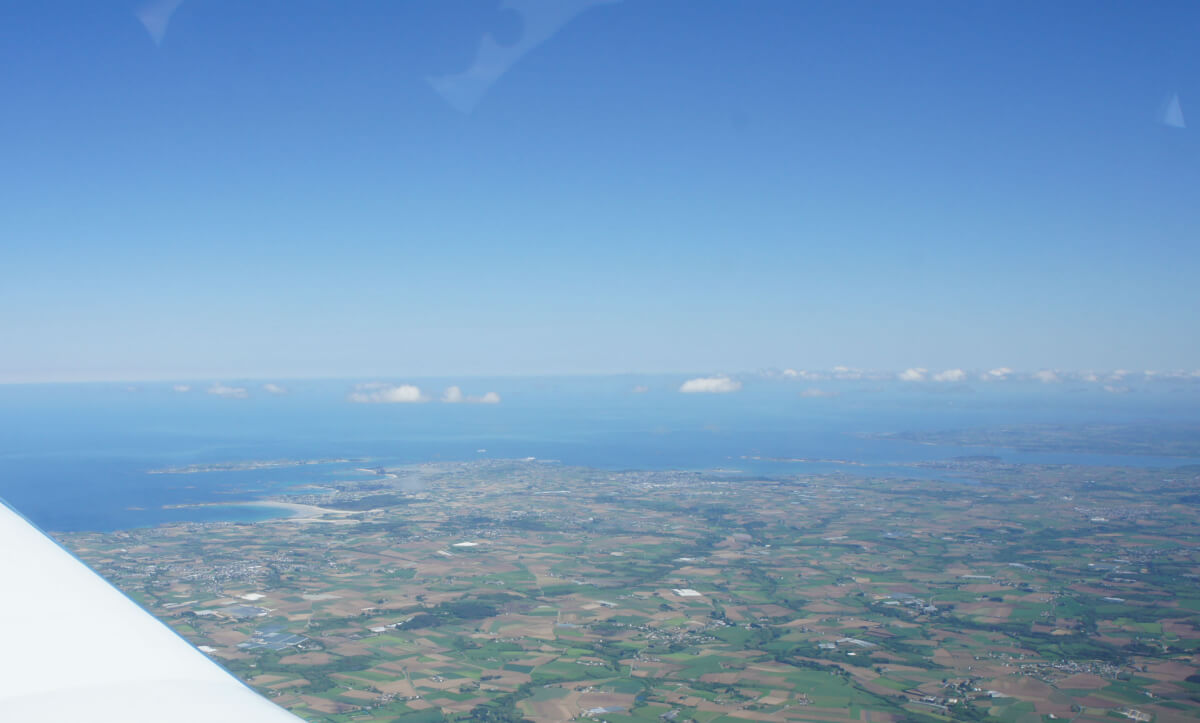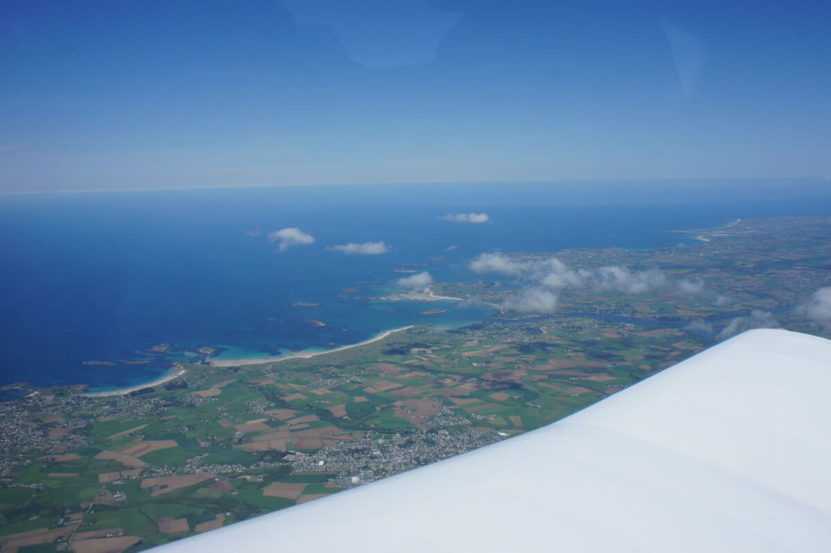 Le vol on top se déroule à merveille avec le survol du Golfe du Morbihan, les Monts d’Arrée. Mais en vue d’Ouessant par le travers de Brest, dame météo nous fait profiter d’un spectacle grandiose : une entrée maritime se déroule telle une vague sous nos yeux et recouvre Brest en 5 mn. Déroutement et nouvelle destination Morlaix !