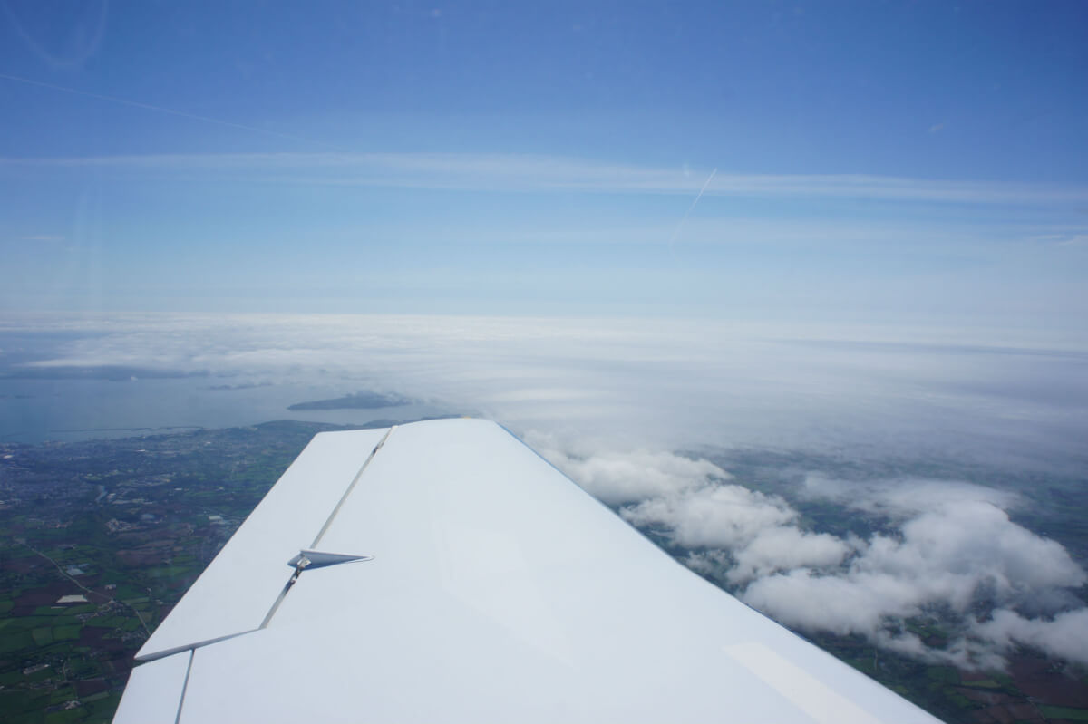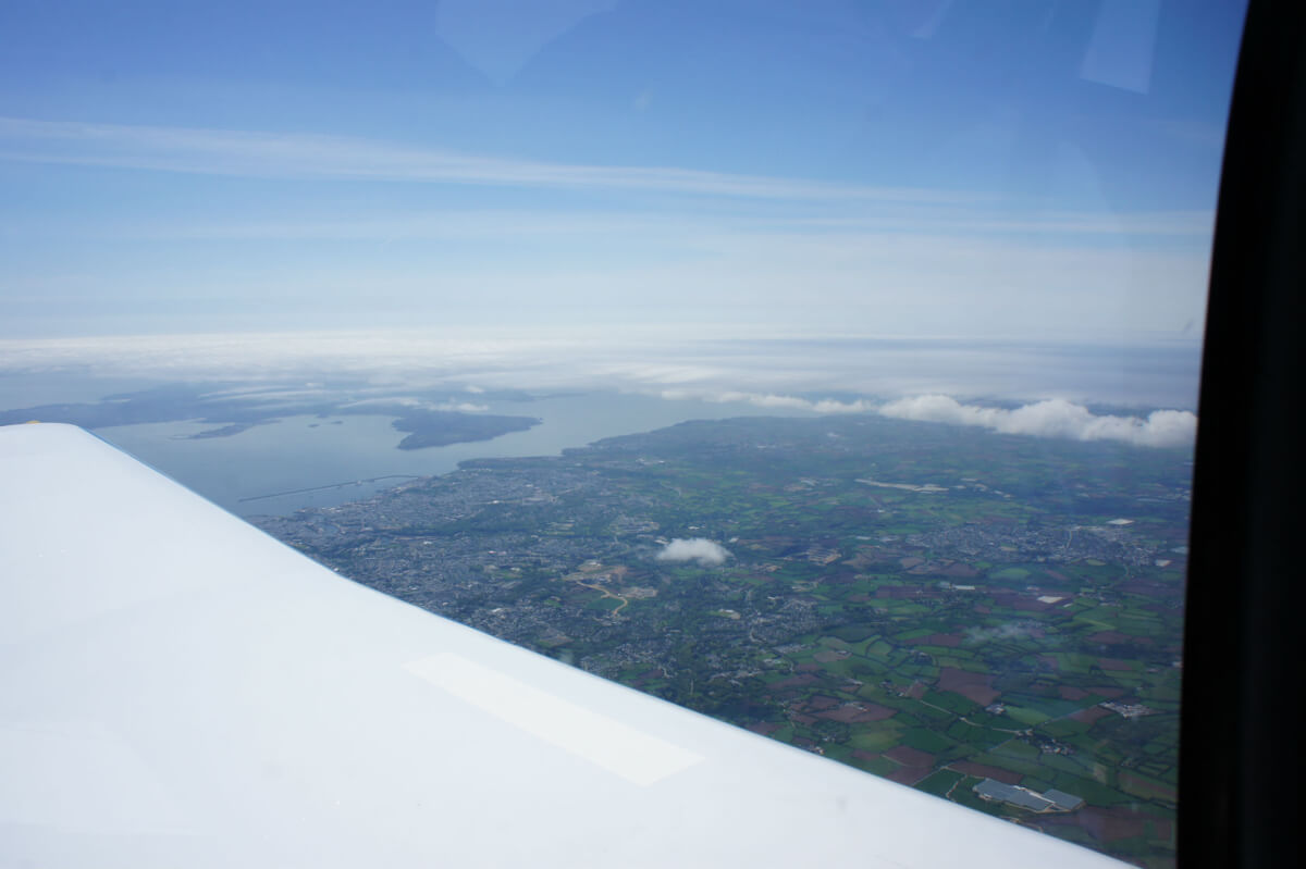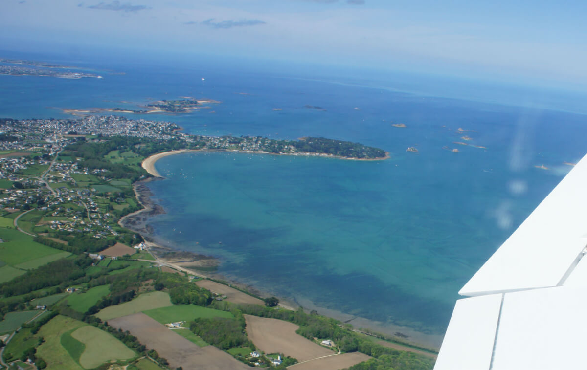 Le vol on top se déroule à merveille avec le survol du Golfe du Morbihan, les Monts d’Arrée. Mais en vue d’Ouessant par le travers de Brest, dame météo nous fait profiter d’un spectacle grandiose : une entrée maritime se déroule telle une vague sous nos yeux et recouvre Brest en 5 mn. Déroutement et nouvelle destination Morlaix !